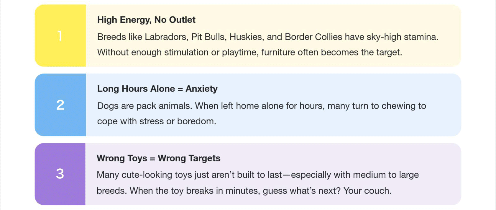 After talking to thousands of dog parents, we’ve identified three common situations that trigger aggressive chewing: